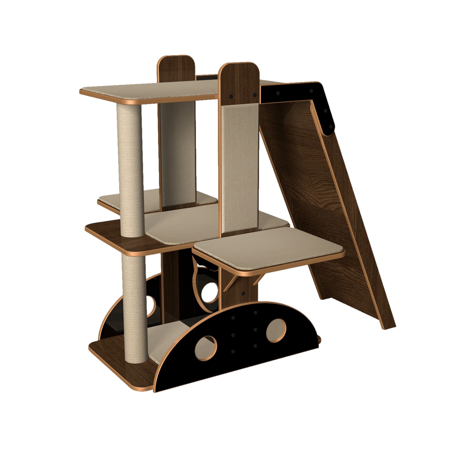 Uma árvore sólida com vários entretenimentos para os gatos, poste forrado, arranhadores laterais, três estágios de prateleira, um poste de sisal e uma rampa. Com 98 cm de altura e suporta até 35 quilos em cada uma das plataformas. É confeccionada em MDF de 15 mm com os topos resinados, as área de conforto é composta por um tecido colado sobre uma manta de espuma e fixado em um compensado, o que facilita a troca do tecido quando estiver puído. Oferecemos refil para os tecidos, sisal e para a madeira. É enviada desmontada e sua montagem é muito simples e as ferramentas necessárias para a montagem vão junto com a Carmen.